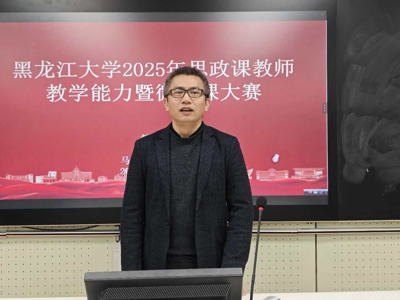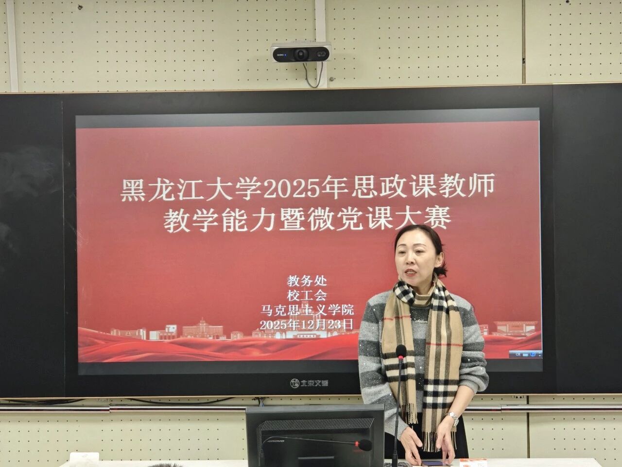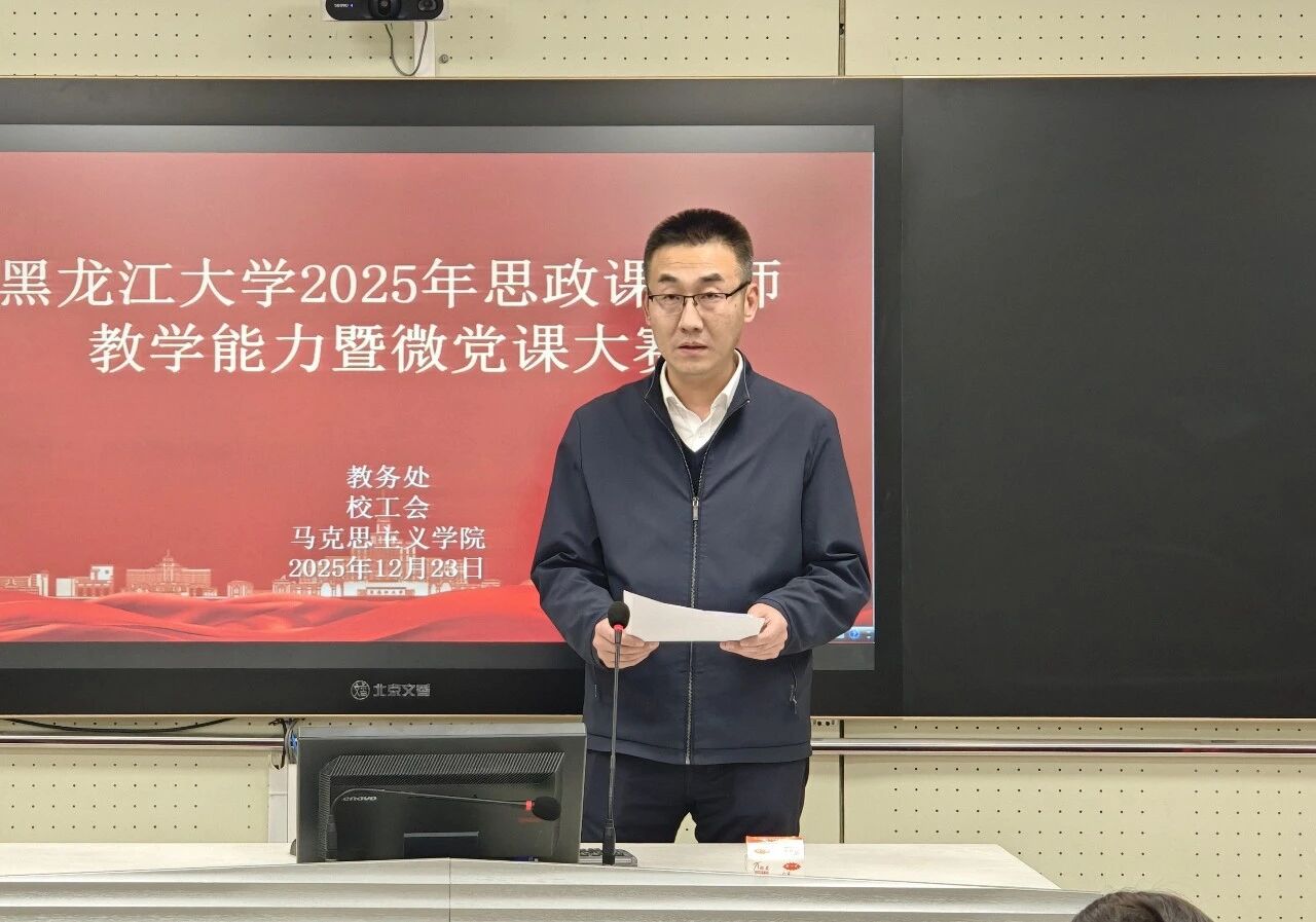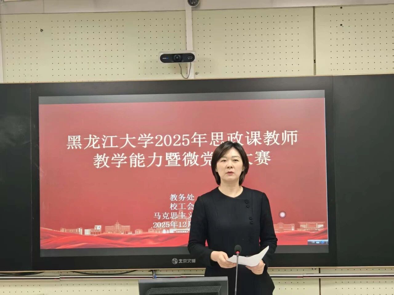 为深入贯彻落实习近平总书记关于学校思政课建设的重要指示精神,落实《普通高校思政课教师队伍建设规划(2025—2027年)》要求,持续推进思政课改革创新,切实提升思政课教师教学能力与育人水平,12月23日,黑龙江大学2025年思政课教师教学能力暨微党课大赛在汇文楼509智慧教室举办。本次大赛特邀黑龙江省高校思政课教指委专家及省委宣讲团专家担任评委,校工会副主席李文达、教务处副处长李雪松出席开幕式并致辞,马克思主义学院领导班子成员及教师代表参加活动。大赛由马克思主义学院党委书记张丹主持。