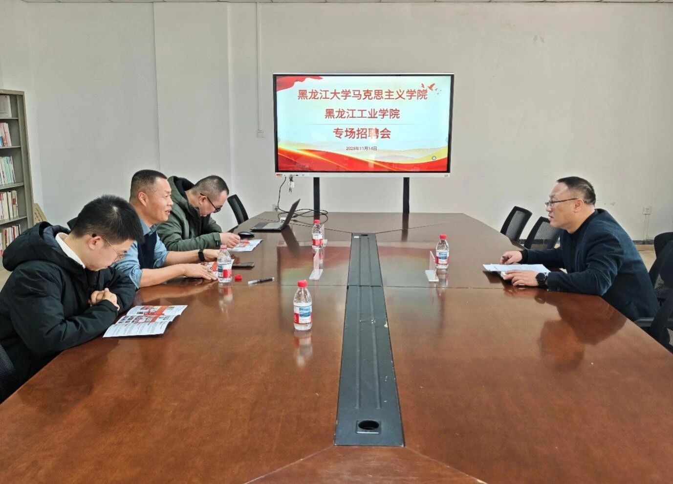 为深入贯彻落实学校关于毕业生就业工作的部署要求,进一步拓宽我院毕业生就业渠道,搭建高质量的就业平台,11月14日,黑龙江大学马克思主义学院举办黑龙江工业学院专场招聘会。黑龙江工业学院马克思主义学院院长韩敬瑜、教科研办公室主任乔学男、党政综合办公室副主任张泽栋及黑龙江大学马克思主义学院党委副书记朱毅、学院硕博毕业生参加招聘会。本次会议由朱毅主持。