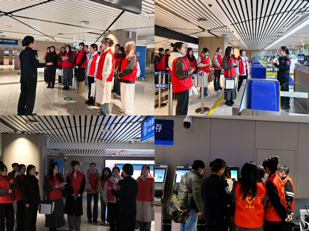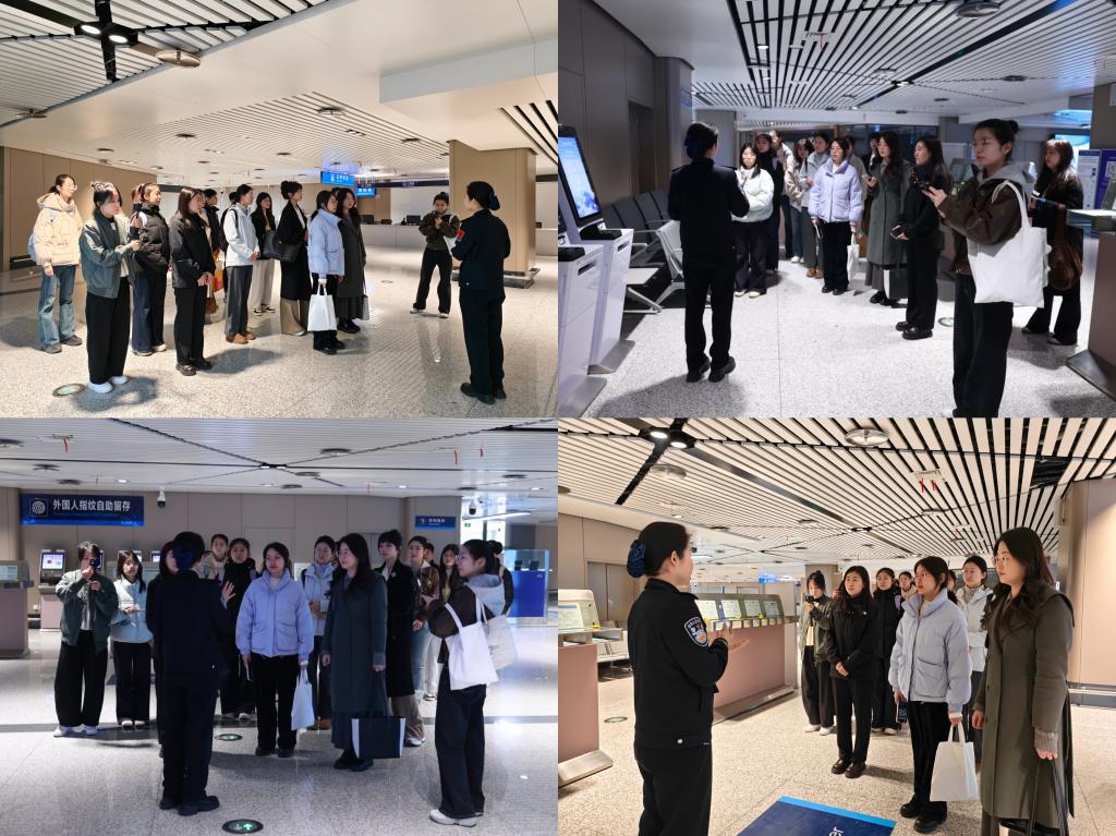 我院师生在边检民警许韵凝等人的带领下开展实地研学。民警以哈尔滨空港口岸为实景教学阵地,结合一线工作讲解海关与边检的职责划分、出入境查验流程,让学生领会边检在维护国家主权、完善国家治理中的核心意义。另外,还重点介绍了亚冬会期间口岸的高效保障工作,详细讲解口岸智慧化建设与便民服务举措,同时介绍了国际航线布局、俄罗斯免签政策实施成效,让学生直观感受新时代口岸治理实践,深化对东北振兴与国家对外开放战略的认知。
